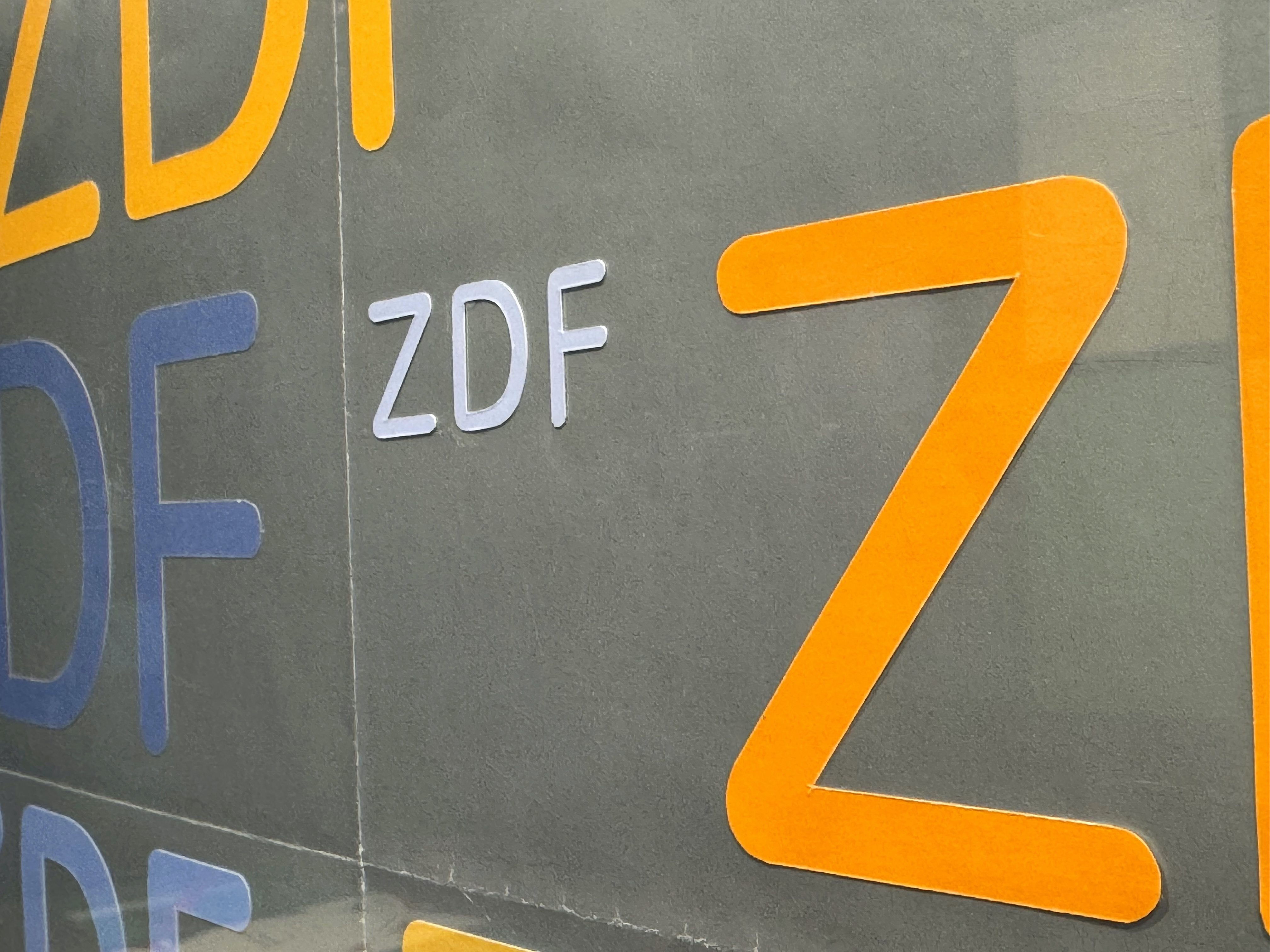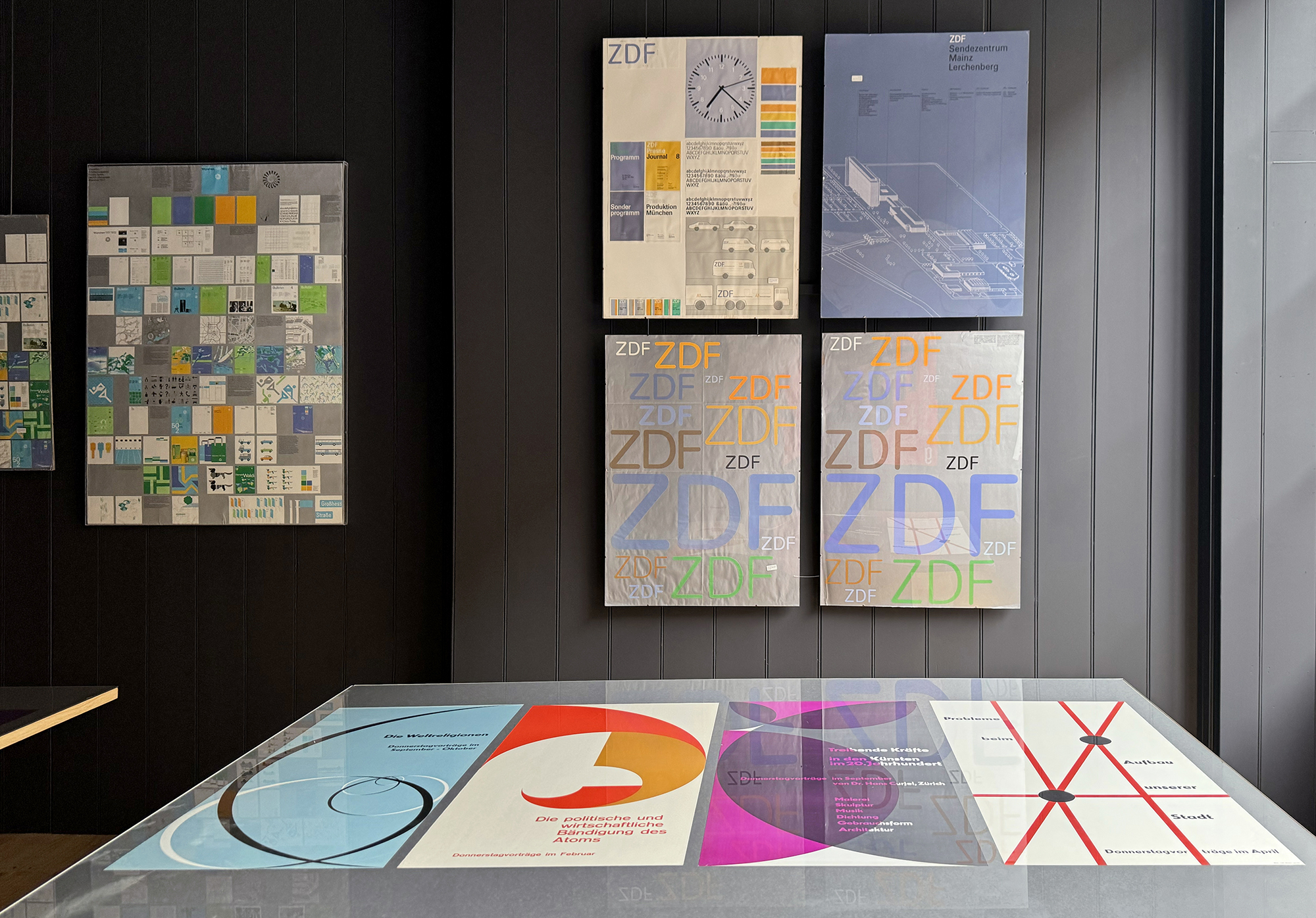 Logo for Zweites Deutsches Fernsehen (ZDF, Germany’s version of BBC2), 1973. Aicher found in testing that the tips of the Univers letters would blur, so he redrew them with round terminals. The exhibition features several original mock-ups, although they are so immaculate you could easily mistake them for printed posters.