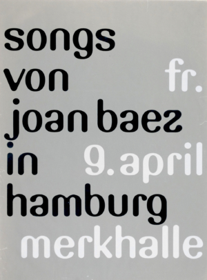 There is a pair of posters of an experimental typeface I can best describe as ‘Verner Panton Sans’ – curvy and blobby, but strictly a sans serif. A sans made friendly. Karl Gerstner designed a similar typeface, trying to reconcile the curves in serif forms with the mechanistic edges of sans. Germans have always worried about the historical mess that is the Latin alphabet, with its capital letters, a whole different set of little letters, and then serif (tradition?) and sans (modern?). What should the future look like? If architects can speculate with ever wilder forms, why cannot graphic designers do the same?