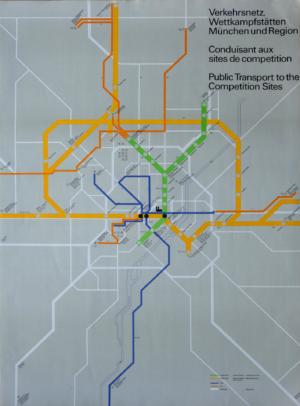 Public transport map, Olympic Games, 1972. The exhibition shows that (combined with superlative quality) what makes Aicher great is his excellence in every field of design. Here he gives a lesson for the ages in information design.