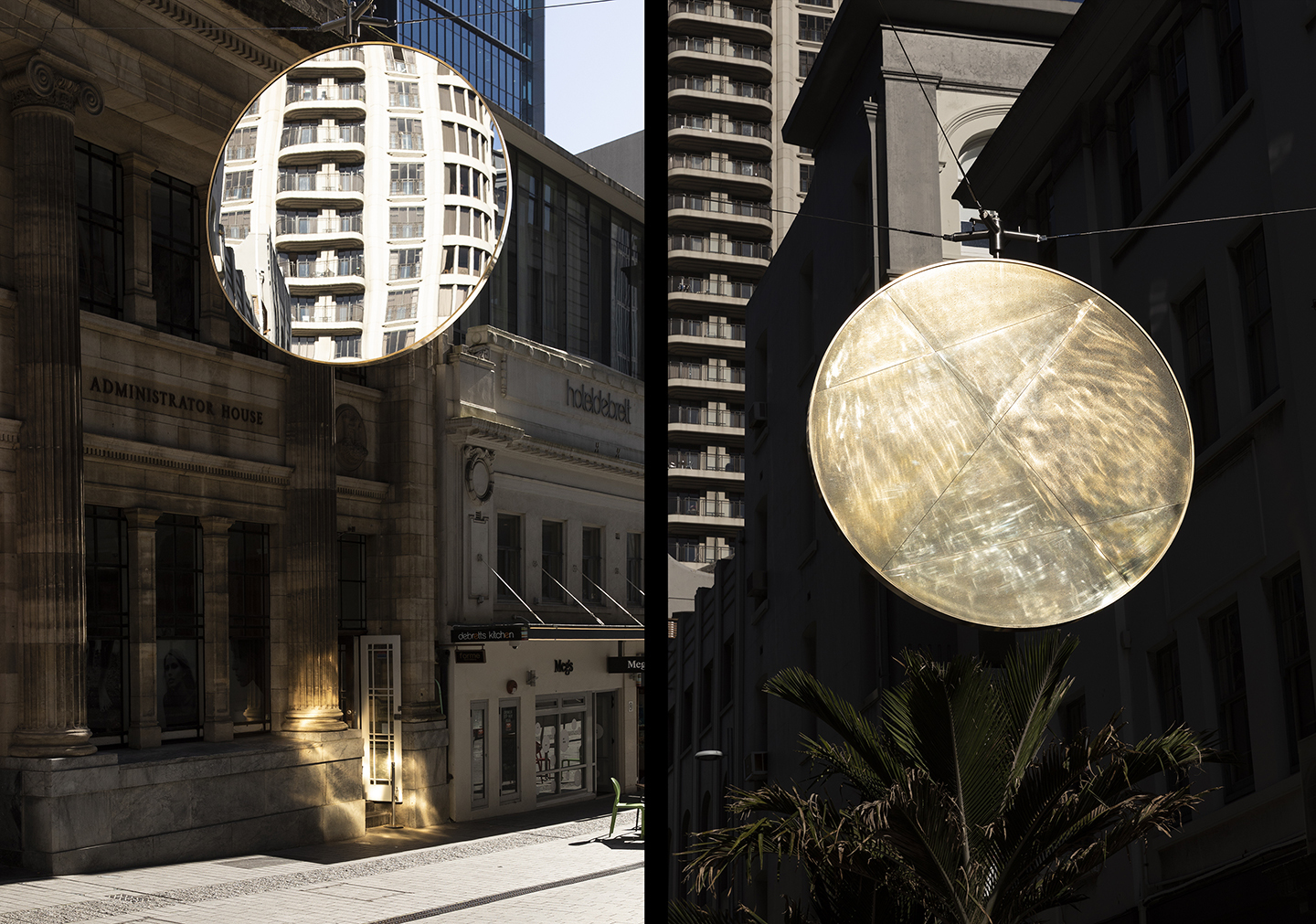 The best of the transcendent work, for which Griffiths is author rather than responder, includes 7/7, 14 views (2023), a site-specific, architectonic work, seen in the background of the main photograph, above. Out of Line (2025), in the foreground, is site specific – shaped by the architecture of the space. The changes in ambient light constantly affect the reading and experience of its form. The two panels to the far right document Griffiths’ Light Weight O, #1-2 (2018), a mirror-faced, brass-backed 2.4 metre circular sculpture suspended above O’Connell Street in downtown Auckland, in Griffiths’ home country of Aotearoa New Zealand, that gently pivots, creating new vistas for the observer to consider in relation to the built environment.