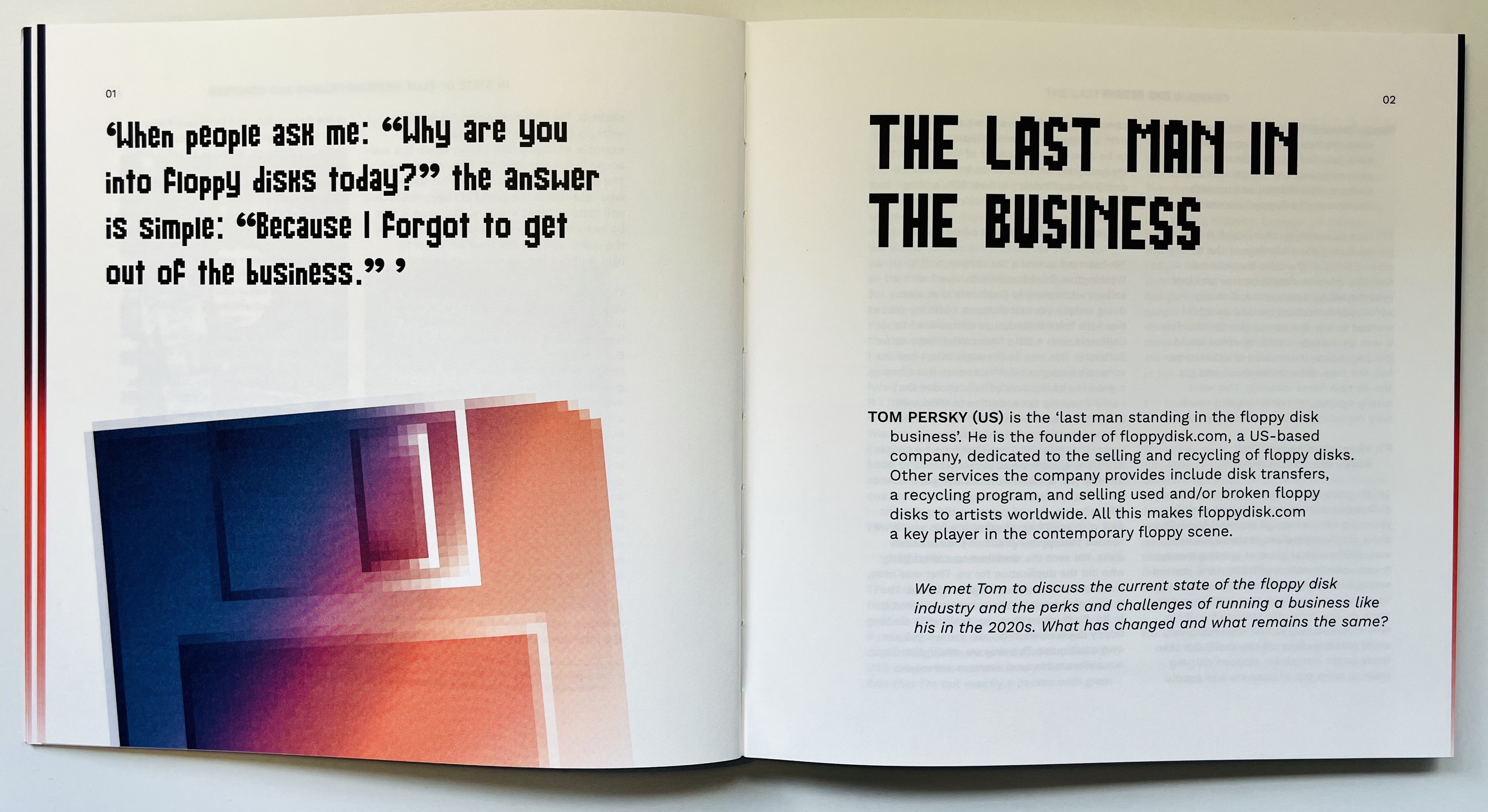 Spread from Floppy Disk Fever which features a quote by Tom Pesky, founder of floppydisk.com and ‘last man standing in the floppy disk business’. Design: Thomas Walskaar.
