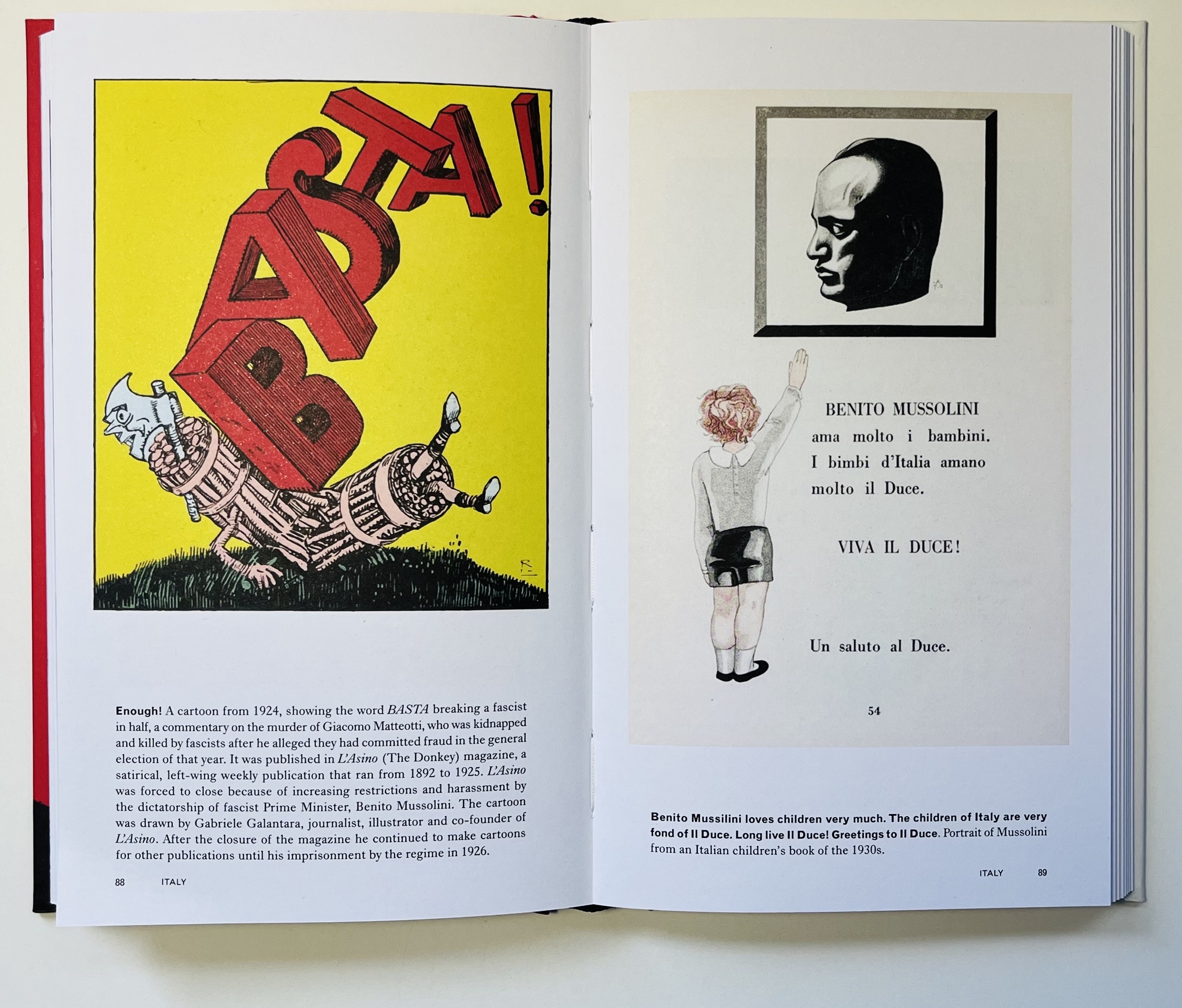 Right. Two Italian posters. The left, a cartoon from 1924, showing the word ‘Basta’ (Enough) breaking a facist in half, published in L’Asino [The Donkey] magazine. On the right of the spread from a children’s book in the 1930s reads ‘Benito Mussilini loves children very much. The Children of Italy are very fond of Il Duce. Long Live Il Duce! Greetings to Il Duce’.