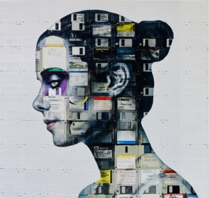 Profile Number 18 by London-based artist Nick Gentry, who repurposes obsolete media for his canvases. Oil paint and used computer disks on wood, 85cm x 81cm, 2019.