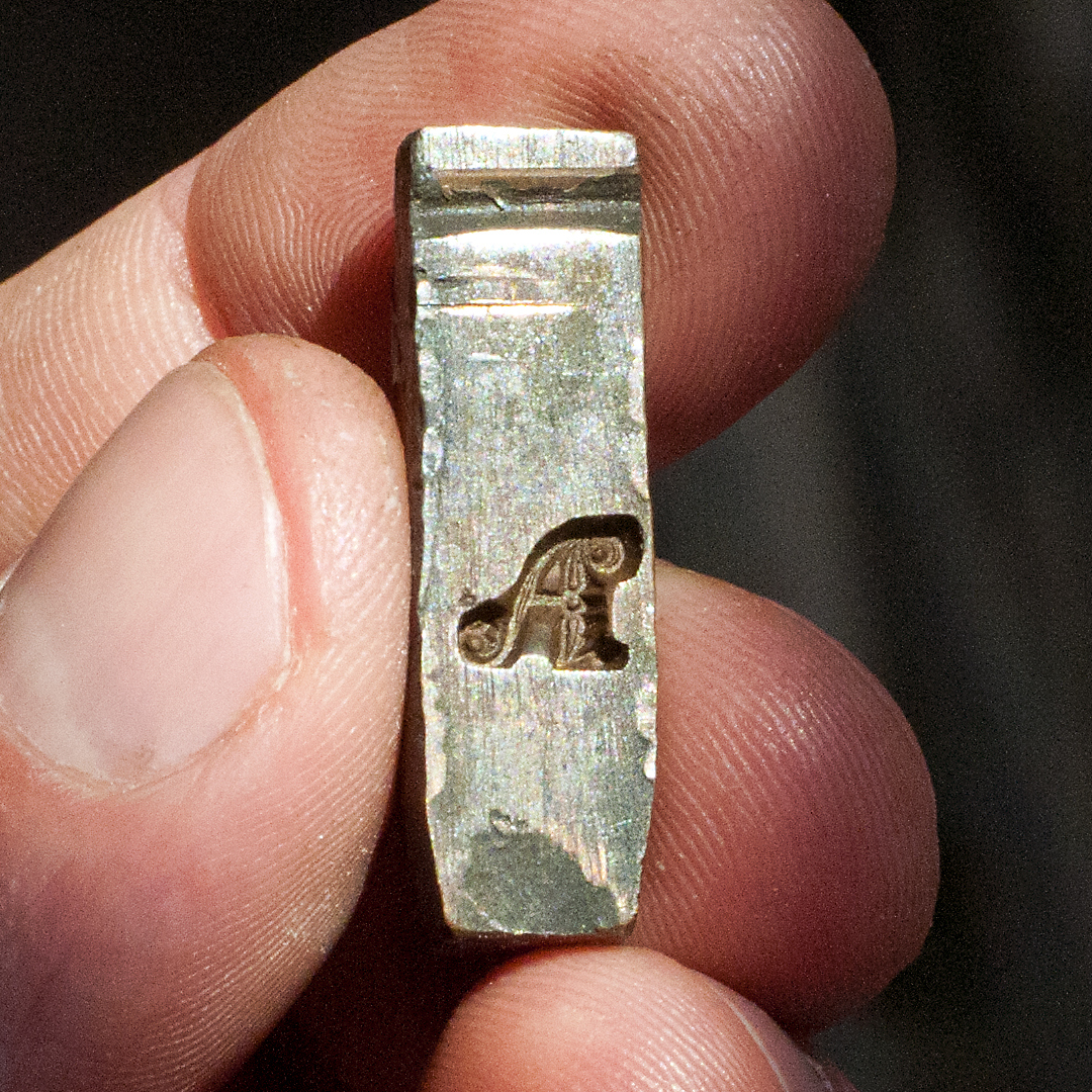 ‘A’ matrix, Union Pearl (the oldest surviving decorated typeface, ca. 1700) at the Type Archive. Photo: Richard Ardagh.