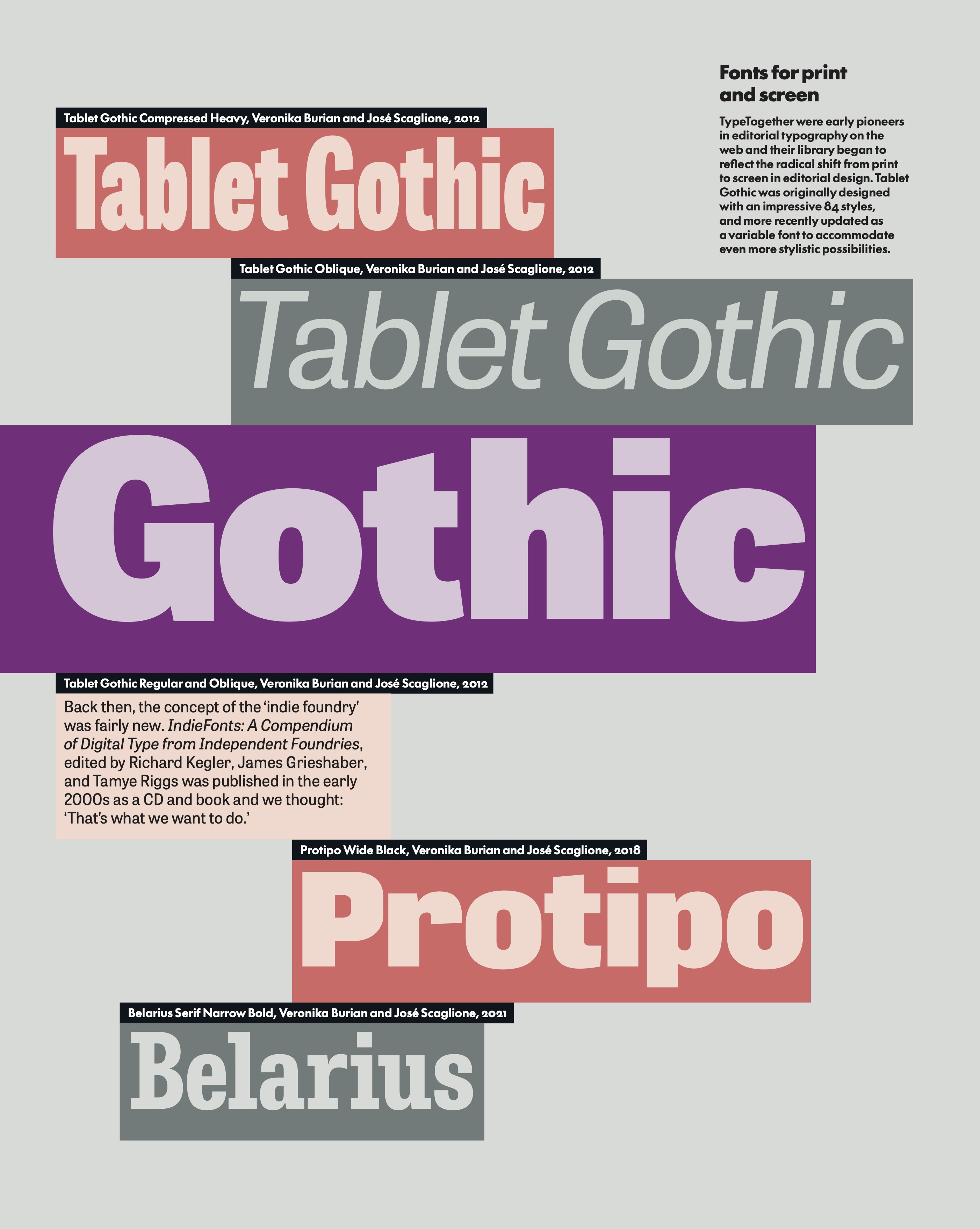 Page from Eye 109, showing typeface designs by TypeTogether’s Veronika Burian and José Scagliano.
