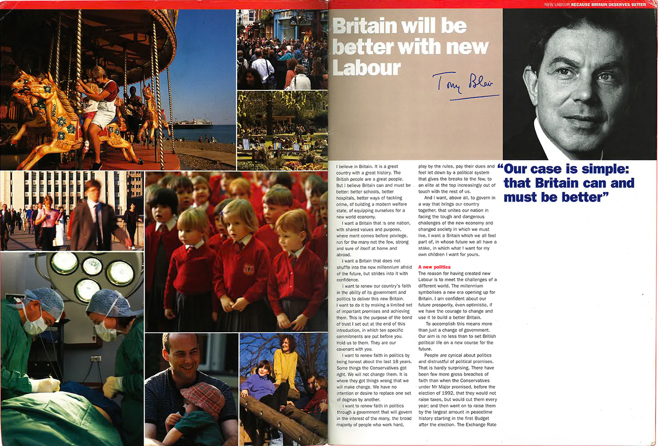 Cover for the magazine version of the 1997 New Labour manifesto, design by Giant. Below. Inside spread of the magazine.