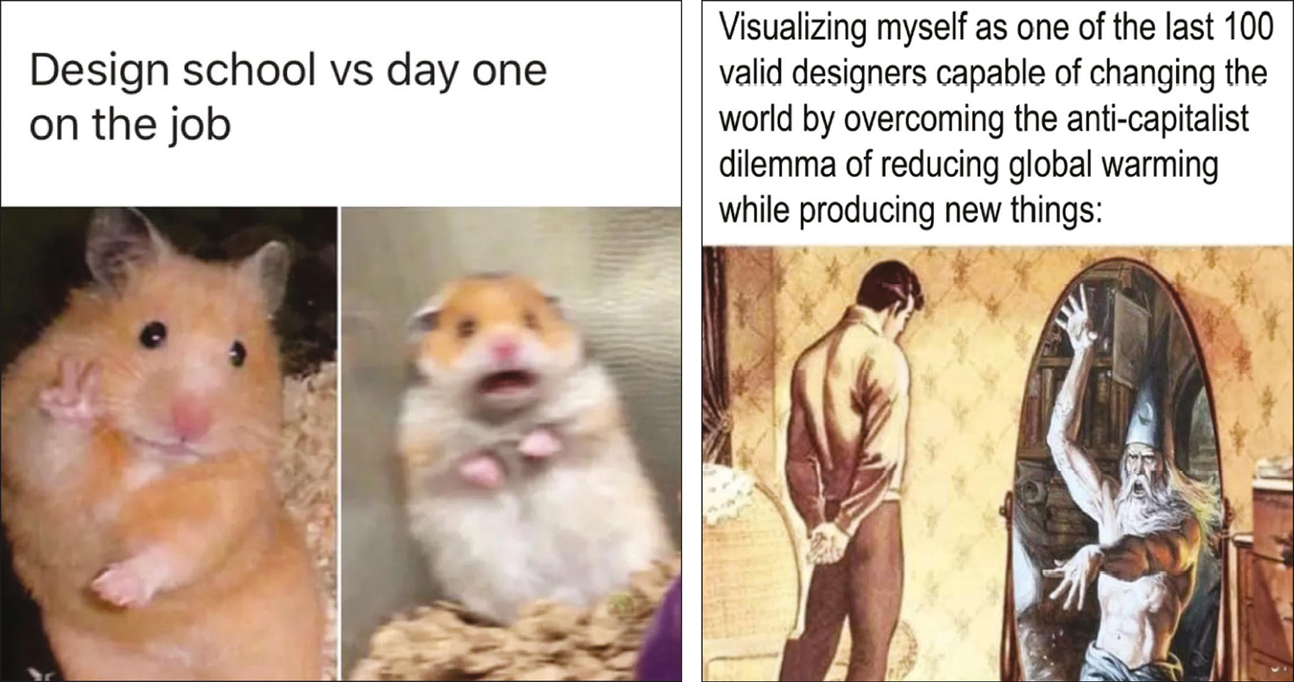 Left. Found image, source unknown. Right. Meme made during ‘Meme Things First’ seminar, UIAV, Venice, 2024.