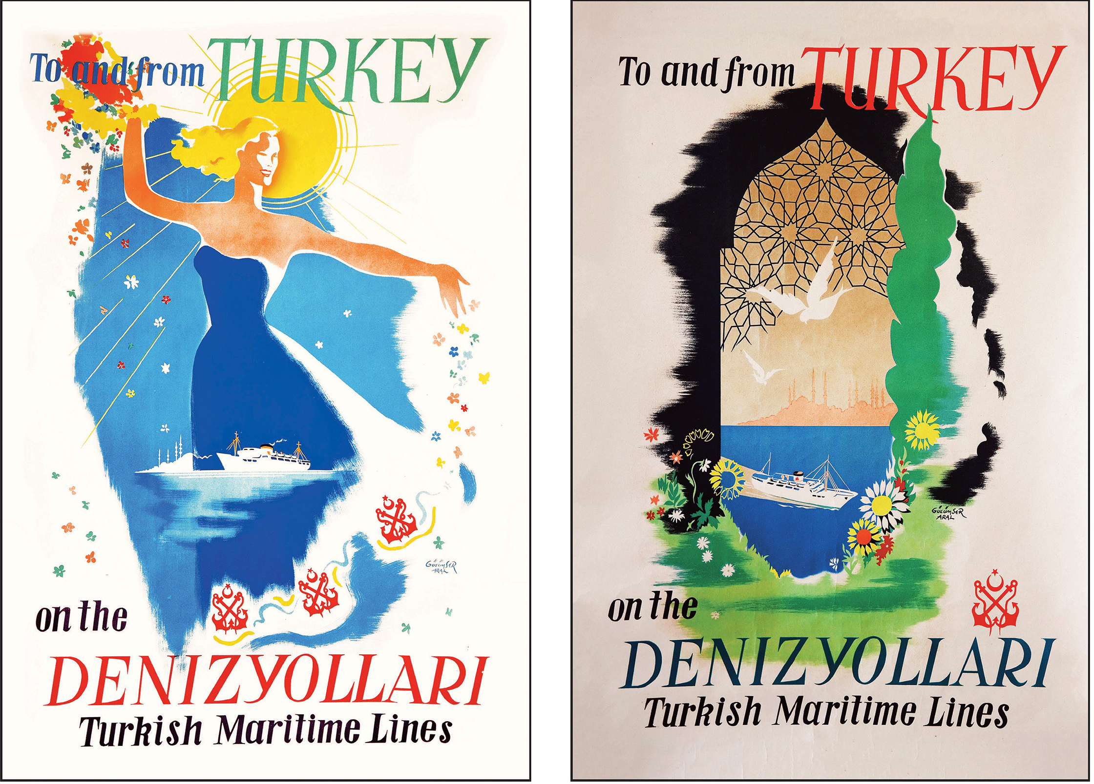 Two poster designs for Denizyolları, ca. 1950s. Credit: Gülümser Aral Üretmen. Courtesy of the Ömer Durmaz Archive and shown in ‘A Pioneering Turkish Female Graphic Designer’, by Ömer Durmaz and Murat Ertürk, in Women Graphic Designers: Rebalancing the Canon edited by Elizabeth Resnick, 2025.