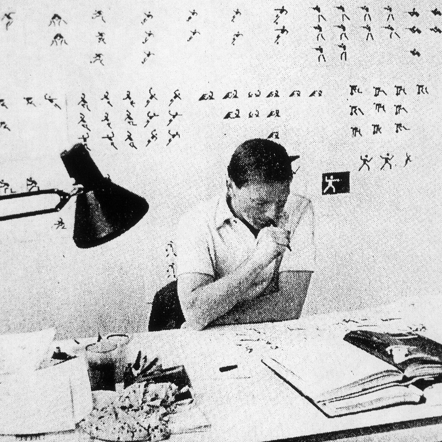 The modern moment, in which Holt can scale and shift elements to unprecedented degrees of fineness, and copy-paste ad infinitum, the technology removes all constraints. He can examine and remake the pictograms with no physical, time or budget constraints.