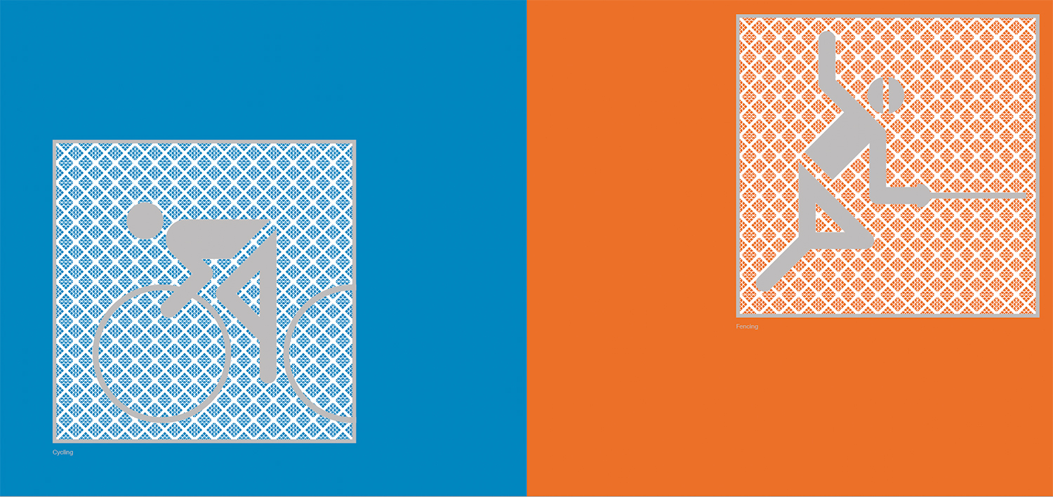 A spread from the booklet showing the revised pictograms for cycling and fencing.