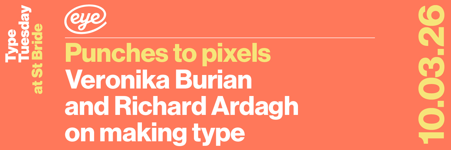 Don’t forget to book your tickets for Type Tuesday: Code is dead (long live code!), Eye’s next Type Tuesday at St Bride Library, London on 20 May at 7pm (doors open 6:30). The 50th (!) edition of our ever-popular lecture series will feature leading digital designers including Field’s Jann Choy (and Eye 107 cover star), Joel Gethin Lewis from Universal Everything and designer, coder and artist Oswin Tickler. Eye’s editor John L Walters and art director Simon Esterson will kick off the evening with a brief talk to launch Eye 108 which is published this Friday.