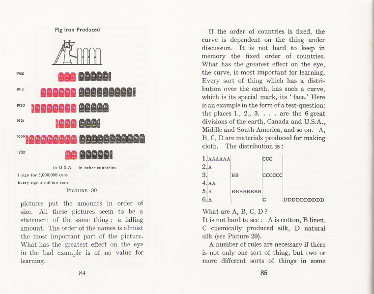 What lives on in this book? Working your way through the strange deformations of Basic English and the sometimes touching antiquity of the images, you find things that must be pertinent, still, for any designer. For example: the continuous line of a graph (‘curve’ in Basic English) tells an untruth. We have only isolated data: so show those, as discrete bars. Or, how to order a set of quantities? By size? But then you only see the same story: increase or decrease. Better to find another principle of order: perhaps time or geography. Design a system that will let the material speak for itself. Above all there is the founding idea of Isotype: in representing quantities, repeat a unit, don’t enlarge it. Don’t say more than you know.